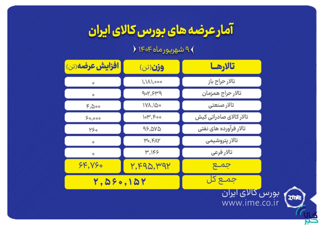 در تالار فرعی 3 هزار و 146 تن محصول شامل فولاد، ضایعات، مواد شیمیایی و پلیمری عرضه می شود.