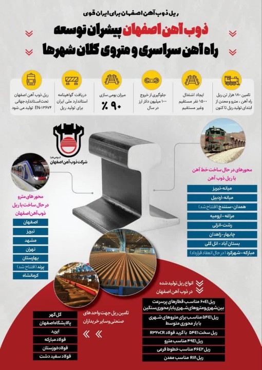 ذوب آهن اصفهان به عنوان تنها تولید کننده ریل در غرب آسیا و همچنین پیشران توسعه راه آهن سراسری و متروی کلان شهرها در سالن 11 – 10 با ارائه سبد متنوع محصولات ریلی نظیر (60E1 مناسب قطارهای پر سرعت بین شهری و متروهای شهری با بار محوری سنگین، (ریل 54E1 مناسب برای متروهای شهری با بار محوری متوسط،( ریل 54E1 با گرید فولاد R320CR  از نوع سخت و ضد سایش)، (ریل 49E1 مناسب مترو)، (ریل 46E2 مناسب خطوط فرعی) ، ( ریل 60E1A1 زبانه سوزن) و ( ریل R18 ویژه معدن ) در این نمایشگاه مورد توجه ویژه بازدیدکنندگان قرار گرفته است.