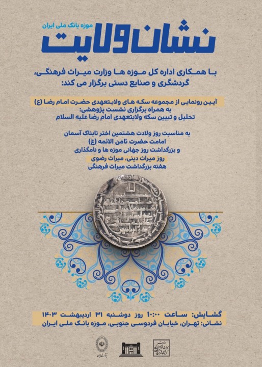به گزارش روابط عمومی بانک ملی ایران، به مناسبت ولادت امام رضا (ع) و بزرگداشت روز جهانی موزه ها و  نامگذاری آن روز با عنوان «میراث دینی، میراث رضوی»، طی مراسمی از مجموعه سکه های ولایتعهدی حضرت امام رضا(ع)، با همکاری ادارۀ کل موزه های وزارت میراث فرهنگی، گردشگری و صنایع دستی در محل موزۀ بانک ملی ایران رونمایی می شود.