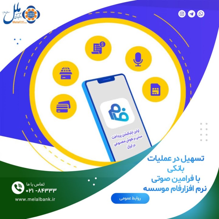 این گزارش میافزاید: موسسه اعتباری ملل، در نرمافزار فام، از هوش مصنوعی یاری جسته و میتوان با نصب این نرمافزار، در قسمت فرامین صوتی، نسبت به خرید شارژ، بسته اینترنتی، پرداخت قبوض، انتقال وجه کارت به کارت،( با شماره کارت ویا مخاطبینی که نرمافزار فام را نصب نمودهاند)، دریافت موجودی، دریافت اطلاعات روز از جمله قیمت ارز و طلا، آب و هوا، ساعت، مناسبت روز، اوقات شرعی و سوالات متداول اقدام نمود.