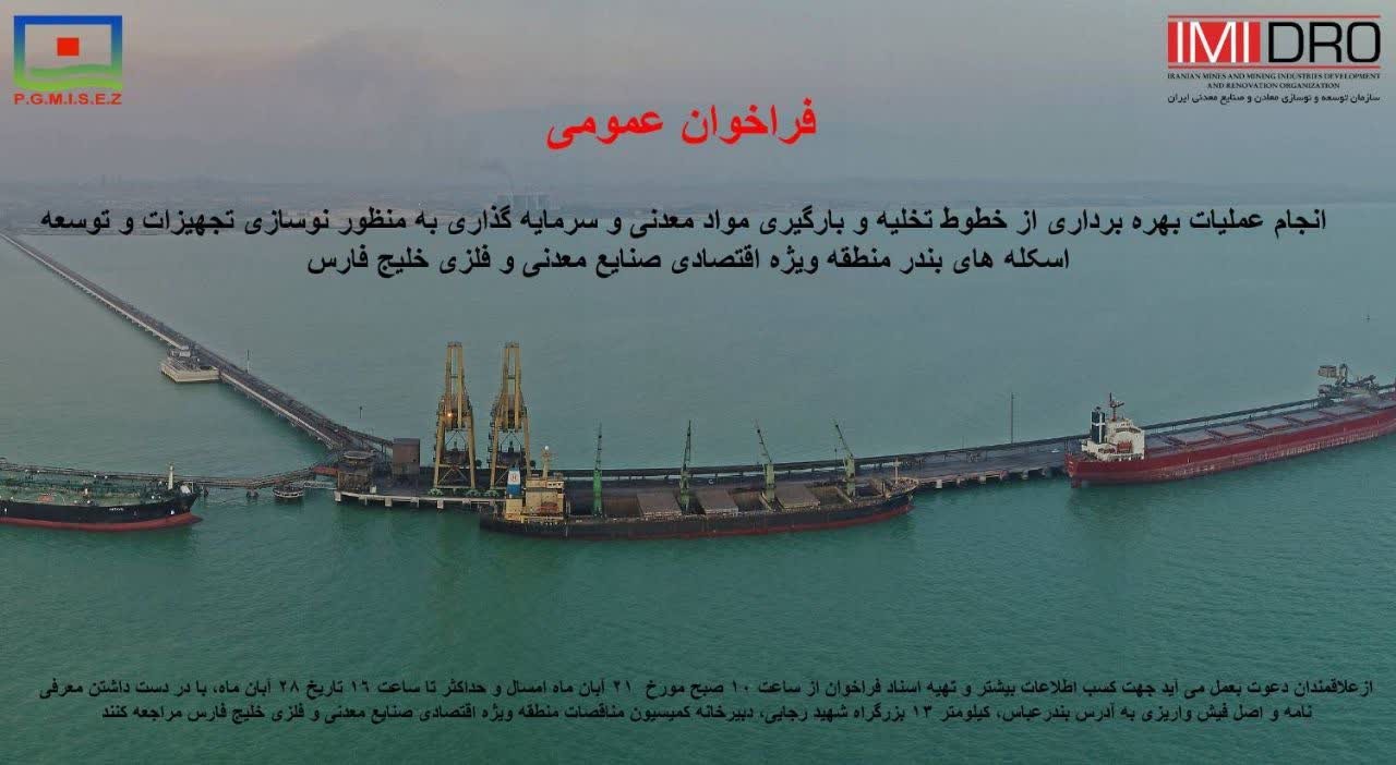 شرکت منطقه ویژه اقتصادی صنایع معدنی و فلزی خلیج فارس به نمایندگی از سازمان توسعه و نوسازی معادن و صنایع معدنی ایران؛ در نظر دارد فراخوان عمومی”انجام عملیات بهره برداری از خطوط تخلیه و بارگیری مواد معدنی و سرمایه گذاری به منظور نوسازی تجهیزات و توسعه اسکله های بندر منطقه ویژه اقتصادی صنایع معدنی و فلزی خلیج فارس واقع در استان هرمزگان”را با جزییات مندرج در اسناد فراخوان برگزار کند.