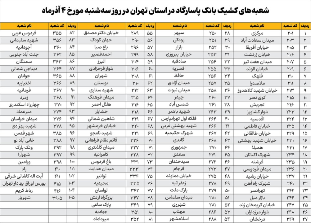 بدینوسیله فهرست شعبههای کشیک بانک پاسارگاد در استان تهران برای روز سهشنبه 4 آذرماه به شرح زیر اعلام میگردد.شایان ذکر است نحوه فعالیت شعبهها در سایر استانها مطابق رویه جاری و براساس تصمیم استانداریهای مربوطه خواهد بود.